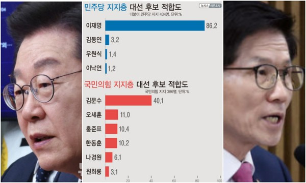 차기 대선 이재명 45.1% 김문수 17.3%....이재명 더불어민주당 대표가 차기 대통령 적합도 여론조사(에이스리서치, 뉴시스)에서 45.1%대로 1위를 기록했다. 김문수 고용노동부 장관이 17.3%로 2위를 기록했다. 이어 한동훈 전 국민의힘 대표(5.4%), 오세훈 서울시장(5.1%), 홍준표 대구시장(4.9%), 나경원 국민의힘 의원(2.8%), 김동연 경기도지사(2.5%), 유승민 전 의원(1.6%), 이낙연 전 국무총리(1.5%), 원희룡 전 국토교통부 장관(1.4%), 안철수 국민의힘 의원과 우원식 국회의장(각 1.3%), 이준석 개혁신당 의원(0.9%), 김부겸 전 국무총리(0.7%), 김경수 전 경남도지사(0.4%) 순이다. '차기 대선이 치러지면 어느 정당 후보를 지지하겠나'라는 질문에는 '민주당 후보'가 51.9%, '국민의힘 후보'가 39.6%로 나타났다.