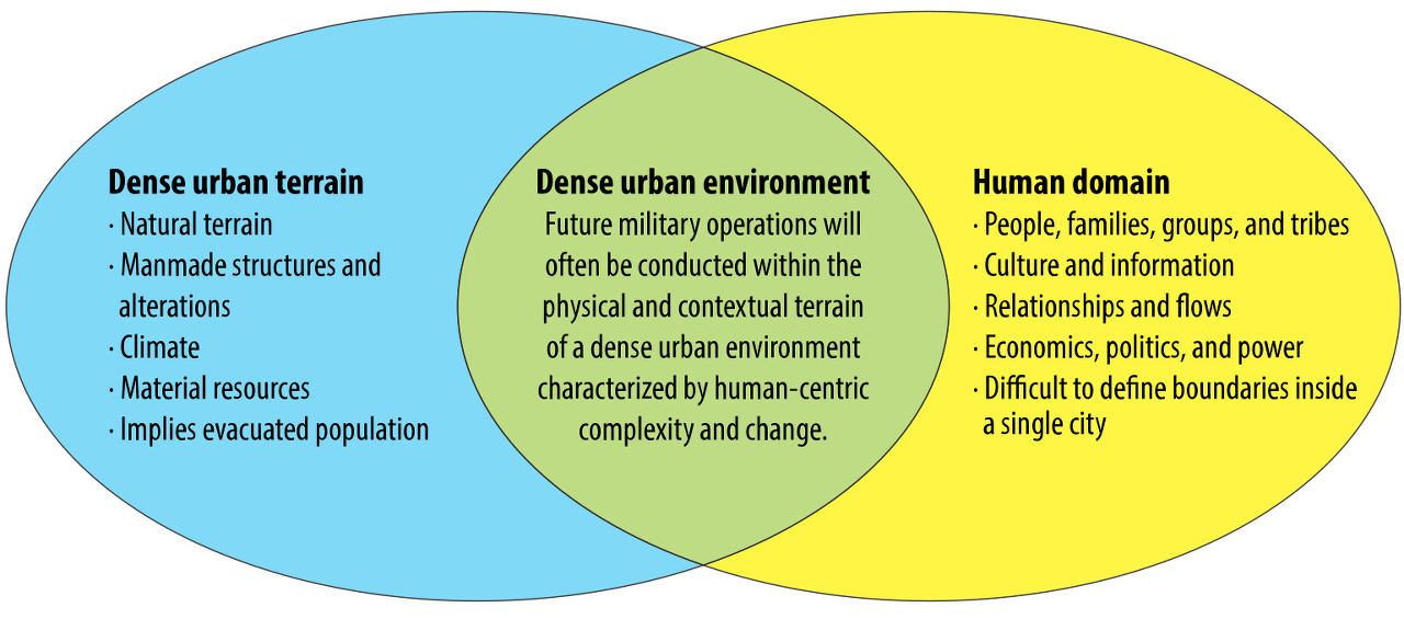 초밀집성은 ➊ 빠른 도시화로 도시 인프라가 확장하는 등 도시 밀도가 증가할 것, ➋ 이로 인해 밀집된 데이터, 사람, 기반 시설로부터 도전 과제가 발생할 것, ➌ 분산된 수많은 기반 시설, 지하 공간 등에 대한 자료 수집은 한계가 있을 것, ➍ 고층빌딩과 지하에서의 전투는 육군의 작전, 자유로운 이동, 부대 방호 등을 어렵게 만들 것이라고 제시되었다.