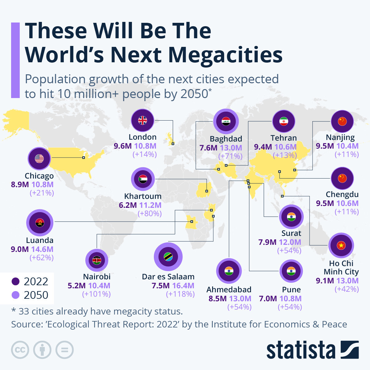 도시 집중 현상의 증가는 인구 천만 명 이상이며, 평방 km당 인구 밀도 2,000명 이상인 초거대 도시인 메가시티(Mega City)를 만들어 냈다. 현재 38개인 메가시티는 2050년에는 그 두 배로 증가할 것으로 예상되며, 아시아·태평양 지역이 급격한 도시화로 인해 메가시티 증가 속도가 가장 빠르다.(https://unhabitat.org/sites/default/files/2022/07/chapter_2_wcr_2022.pd)