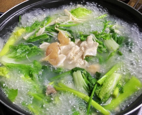 얇게 저민 닭가슴살을 닭을 고아서 만든 진한 국물에