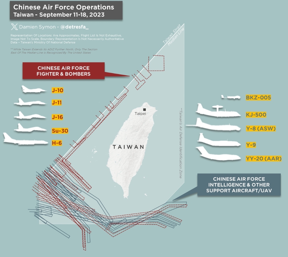 2023년 8월에는 202대의 PLA 공군기들이 대만 주변을 비행하였으며 이는 월별 최고 기록이었습니다.