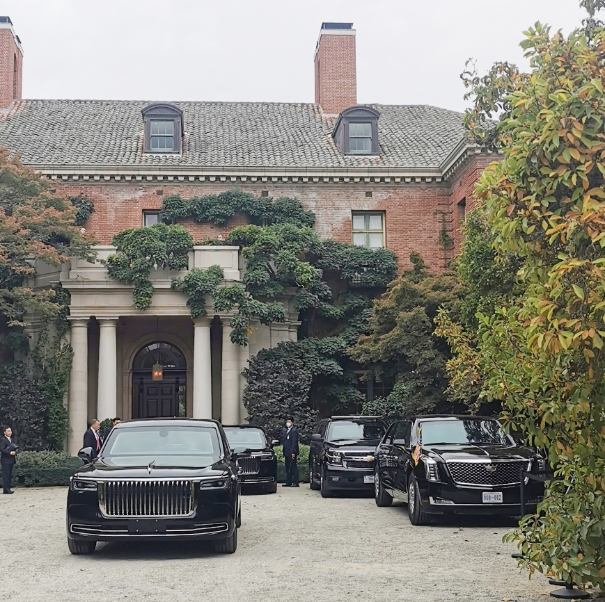 ↓ 중공의 계략에 말려들은 미국, 조 바이든 대통령과 시진핑 중국 공산당 총서기의 회담장 뒷편에 서 있는 시진핑 의전 차량 紅旗(홍치) & 바이든 의전 차량 Beast, (2023.11.16. 한국시각 11시 17분 공개)