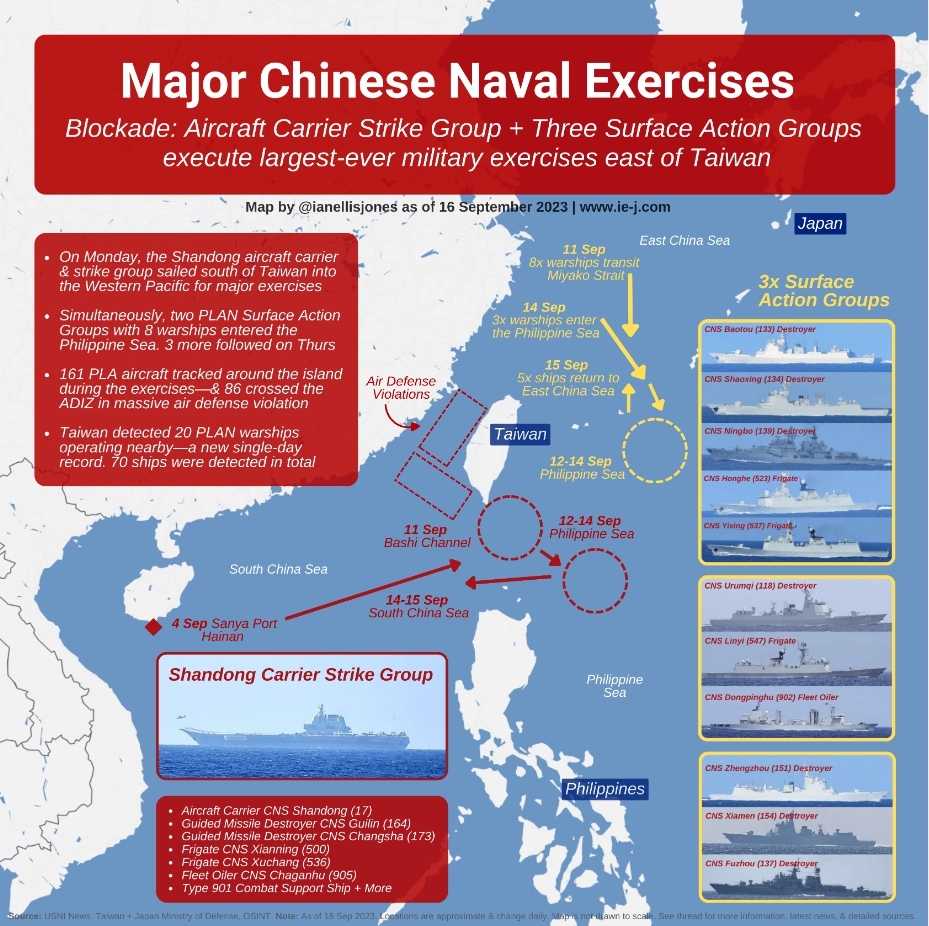 PLA 해군은 대만 동쪽 부근 서태평양에서 예정에 없었으며 예고 없이(바로 이러한 행동이 대만 침공 기습의 시나리오 였음.) 전례없는 사상 최대 규모의 해군 훈련을 실시했습니다.