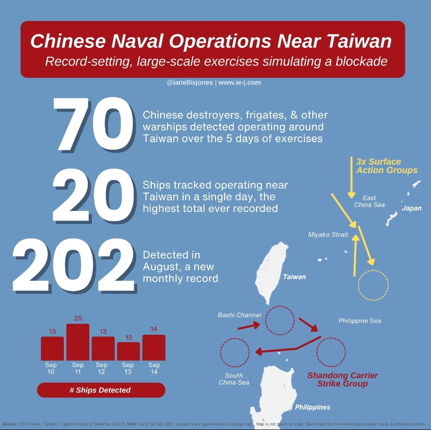 5일간의 훈련 동안 70척의 PLA 구축함, 호위함 및 기타 선박이 대만 주변에서 활동하는 것을 포착하였습니다.