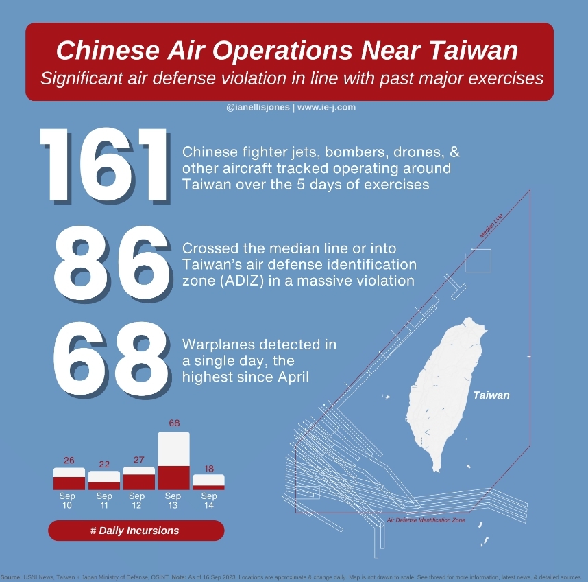 훈련 중 PLA 항공기 161대가 대만 본섬 주변을 추적 비행하였고, 86대가 ADIZ(방공식별구역)을 넘어 대규모 대공방어를 위반하였습니다.