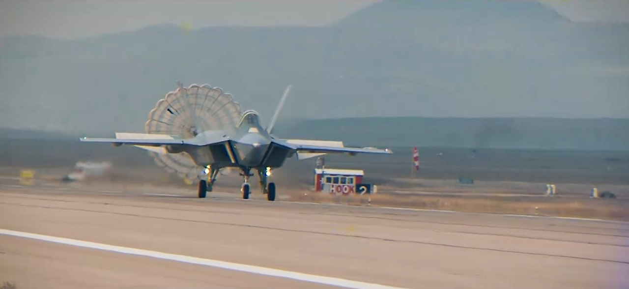 드래그 슈트(감속 낙하산)을 펼치고 무사히 착륙중인 Kaan 전투기