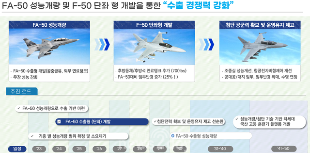 세계 다목적전투기 시장 수요에 발맞춰 KAI의 대표 경공격기인 FA-50의 단좌형을 개발해 포트폴리오를 확대한다는 계획이다.