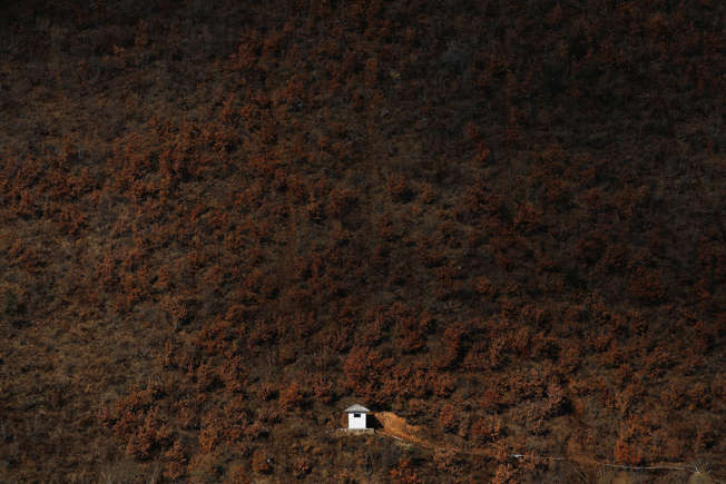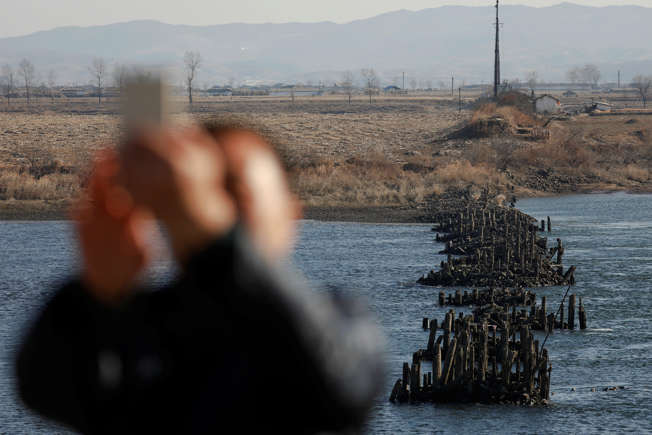 압록강 근처의 북한 감시초소를 중국에서 촬영한 모습.