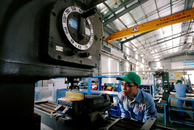 거대한 공장에서 전기 부품을 재활용하는 작업은