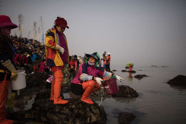 진도 섬 해안으로 몰려들어 바닷물이 물러나고