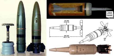 2A46M 주포를 사용하는 전차에서 주로 운용하는 대전차 탄약들. 왼쪽은 리플리카 포발사 대전차 미사일, 오른쪽 위는 3BM-44 날개안정 분리 철갑탄, 오른쪽 아래는 5K29M 125mm 탠덤탄두 대전차 고폭탄이다. <출처 : thaimilitaryandasianregion.wordpress.com>