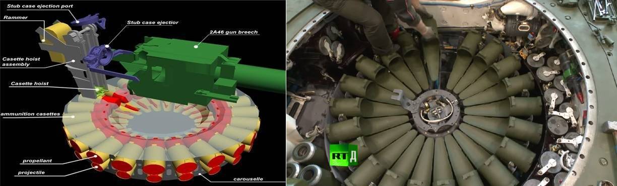 포탑의 하단부에는 T-72 전차와 동일한 유형의 케로젤식 자동장전장치와 탄약이 위치해 있는 것으로 알려져 있다. 따라서 총 22발의 주포탄약이 장약과 분리되어 장전되어 있는 것으로 추정된다. 자동장전장치의 재장전 시간은 최대 6.5초이며 주기 시간은 15초에 한 발로 사격을 한다. 탄약을 모두 소모한 후 승무원이 수동으로 탄약을 재장전하는 시간은 13분에서 15분이 소요되는 것으로 알려져 있다.