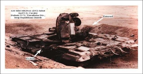 M1A1 전차의 120mm 전차포 날개안정 분리 철갑탄에 피격된 T-72 전차. 대전차호 안에 엄폐했지만, 철갑탄은 전면장갑에서 후면부까지 관통하고 빠져나갔으며, 포탑 아래 위치한 케로젤 자동장전장치 및 포탄과 탄약이 유폭되면서 포탑이 튕겨져 나갔다. <출처: Public Domain>
