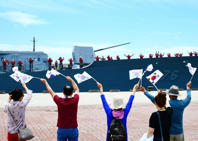 대한민국해군 환태평양훈련전단이 다국적 해상훈련인 2022 환태평양훈련 참가를 위해 5월 31일 오전 제주해군기지에서 출항했다. 해군 장병들이 부두에서 환송을 하고 있다. 해군 제공