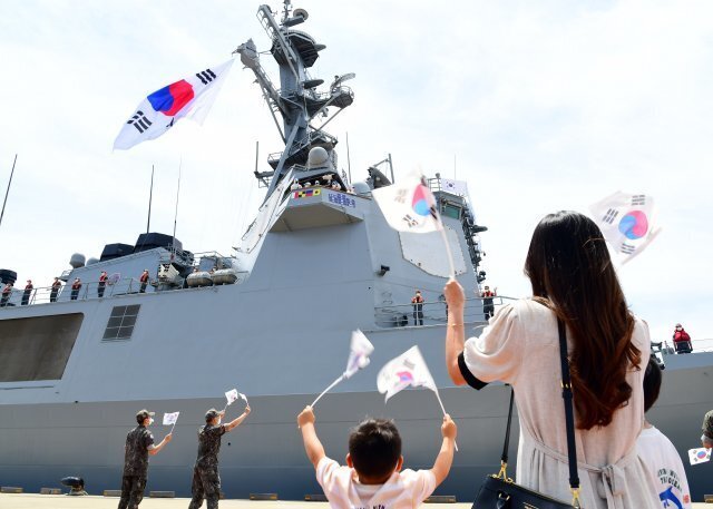 5월 31일 오전 제주해군기지에서 열린 대한민국해군 환태평양훈련전단 환송식에서 가족들이 훈련에 참가하는 해군 장병들을 환송하고 있다.<사진제공 해군>