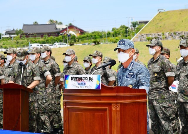 대한민국해군 환태평양훈련전단이 다국적 해상훈련인 2022 환태평양훈련 참가를 위해 5월 31일 오전 제주해군기지에서 출항했다. 훈련전단장 안상민 준장과 지휘부가 강동훈(중장) 해군작전사령관에게 출전 신고를 하고 있다. 해군 제공