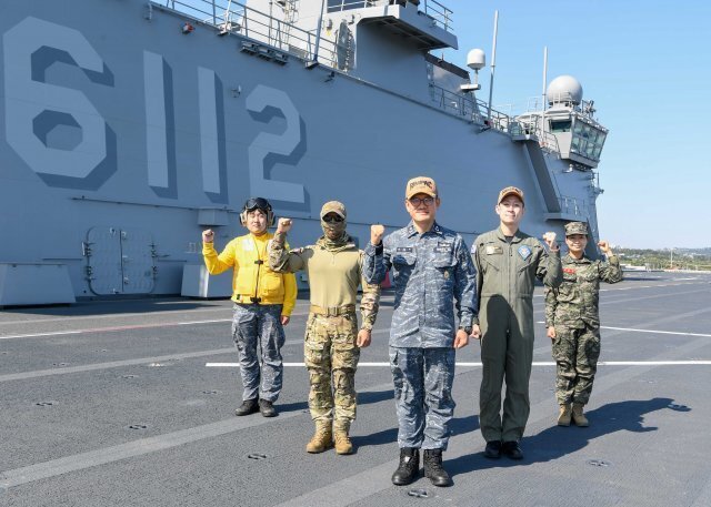 5월 31일 2022 환태평양훈련(RIMPAC)에 참가하기 위해 출항하는 환태평양훈련전단장 안상민 제독(가운데)을 비롯한 대표 장병들이 마라도함(LPH, 14,500톤급) 비행갑판에서 출항 전 임무 완수의 각오를 다짐하고 있다.(왼쪽부터 중사 정양우, 중위 유동욱, 준장 안상민, (임)소령 이영진, 중사 김보영). 해군 제공