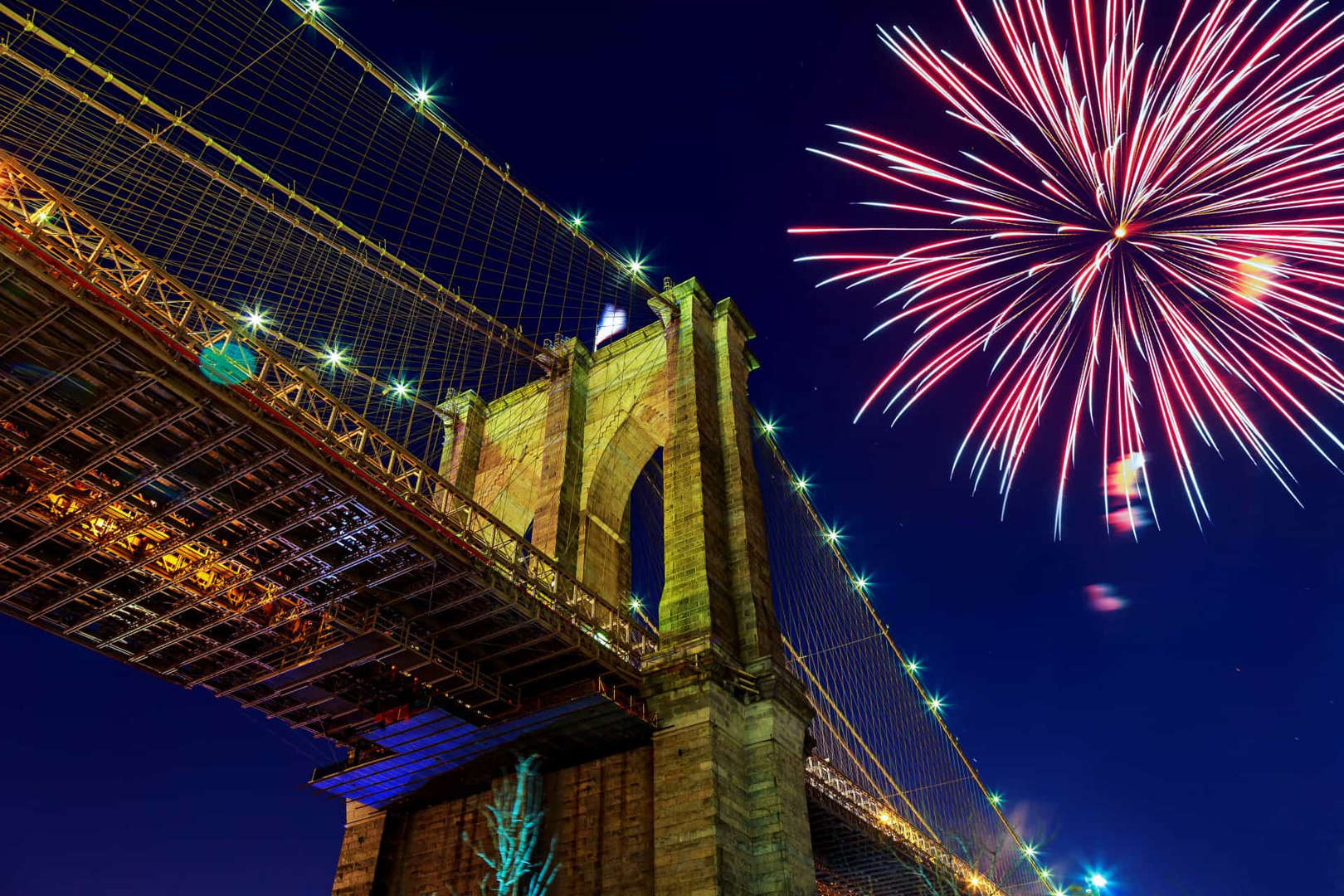 도시의 유명한 다리인 브루클린 다리에서 불꽃놀이를 보며