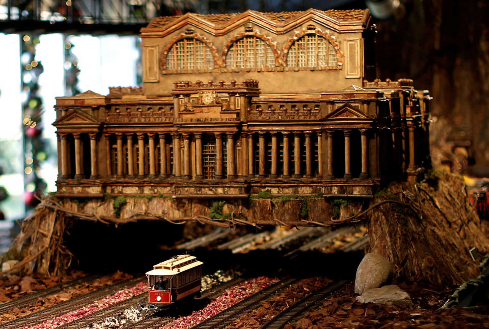 12개의 대규모 모형 철도 기관차가 뉴욕의 소형 도시를 가로 지르며