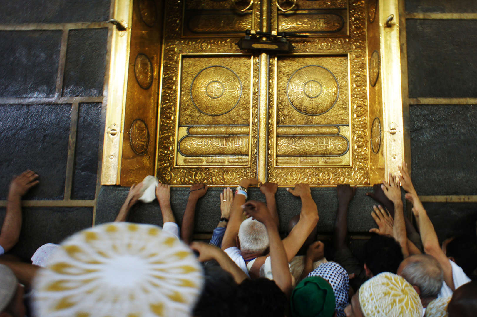 많은 사람들은 검은 돌을 만지고 키스하려고 한다.
