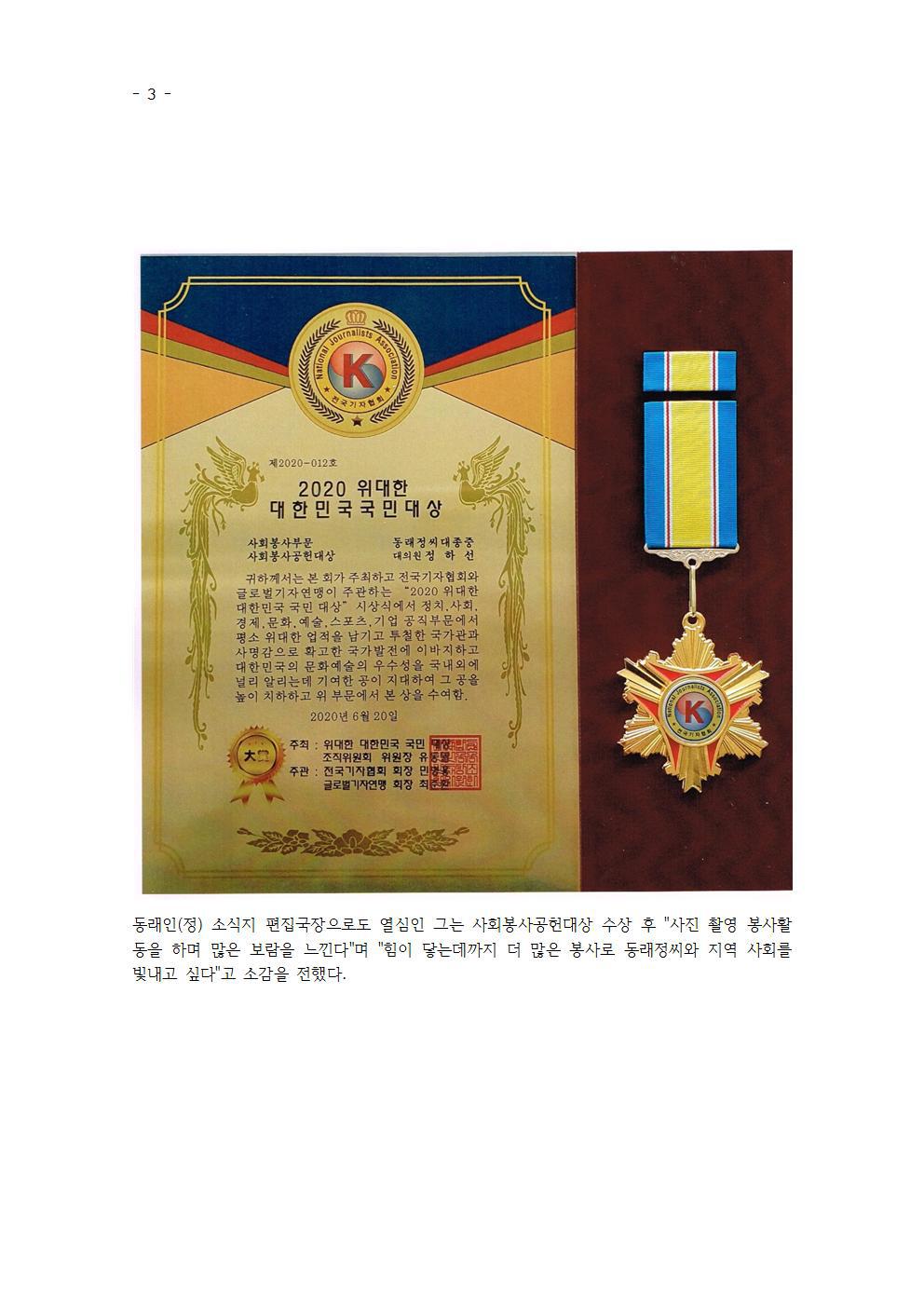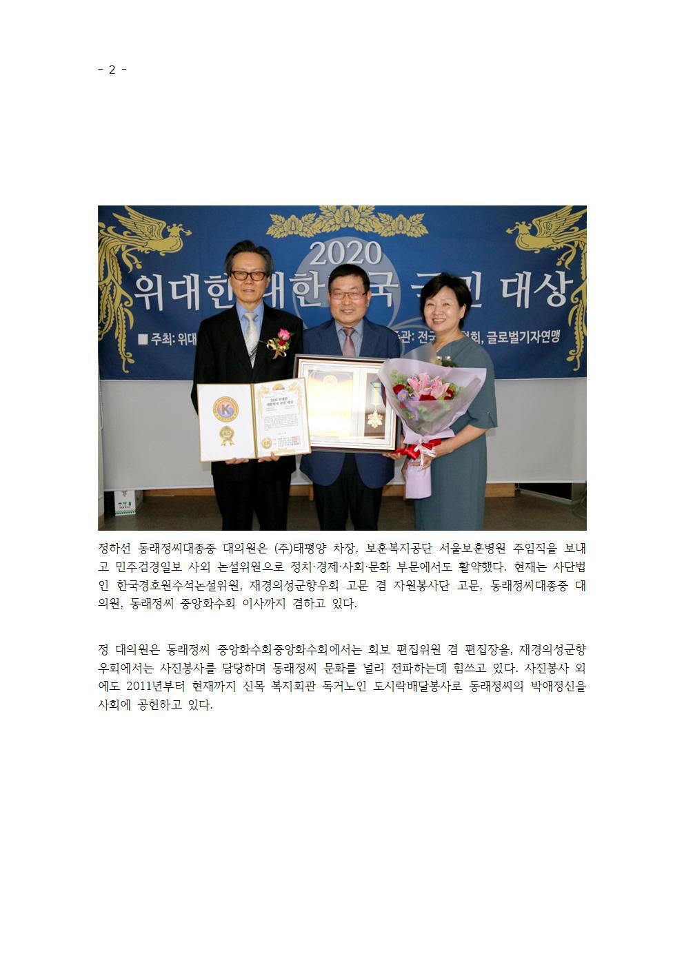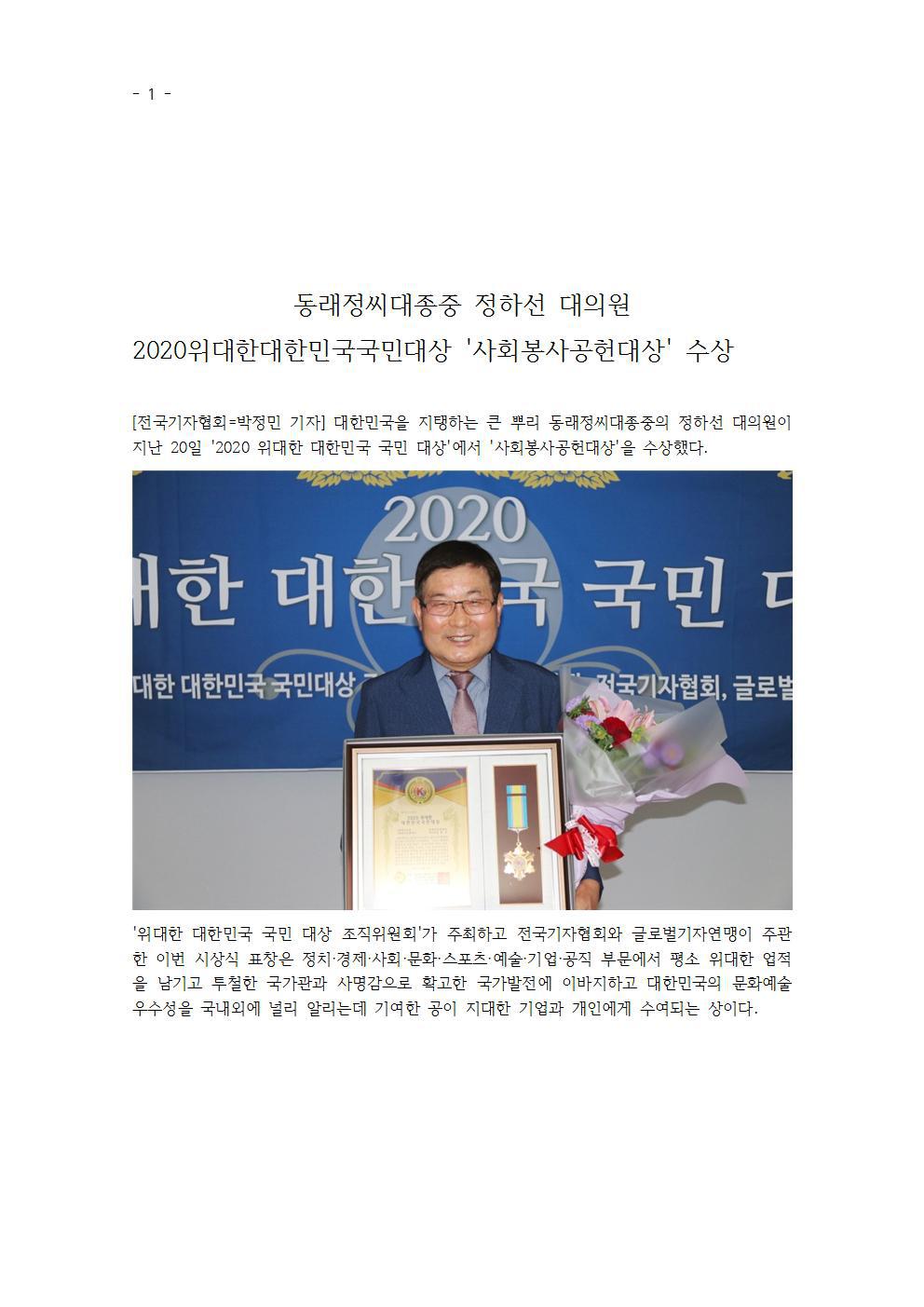 2020위대한대한민국국민대상 '사회봉사공헌대상' 수상 작성자운파정하선|작성시간20.08.05|조회수51 목록 댓글 0 글자크기 작게가 글자크기 크게가 다음검색 현재 게시글 추가 기능 열기 북마크 공유하기 신고 센터로 신고 댓글 댓글 0 댓글쓰기 답글쓰기 댓글 리스트