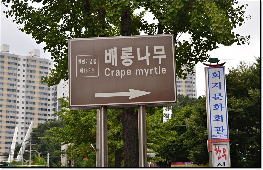 화지공원 우측 입구에는 천연기념불 제168호 배롱나무 간판이 보인다.