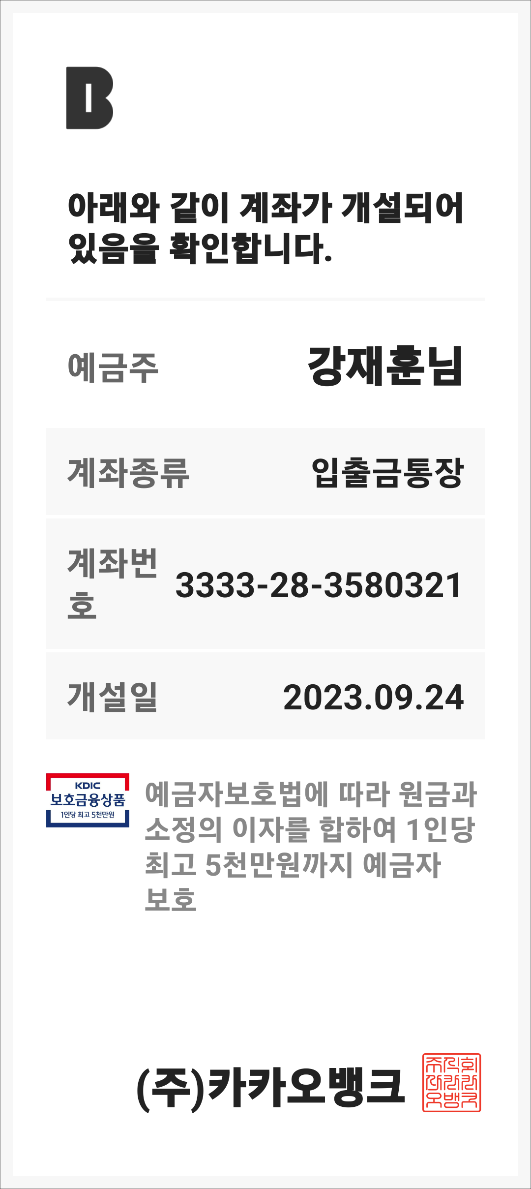 입금계좌 : 카카오 3333-28-3580321 (예금주 강재훈)