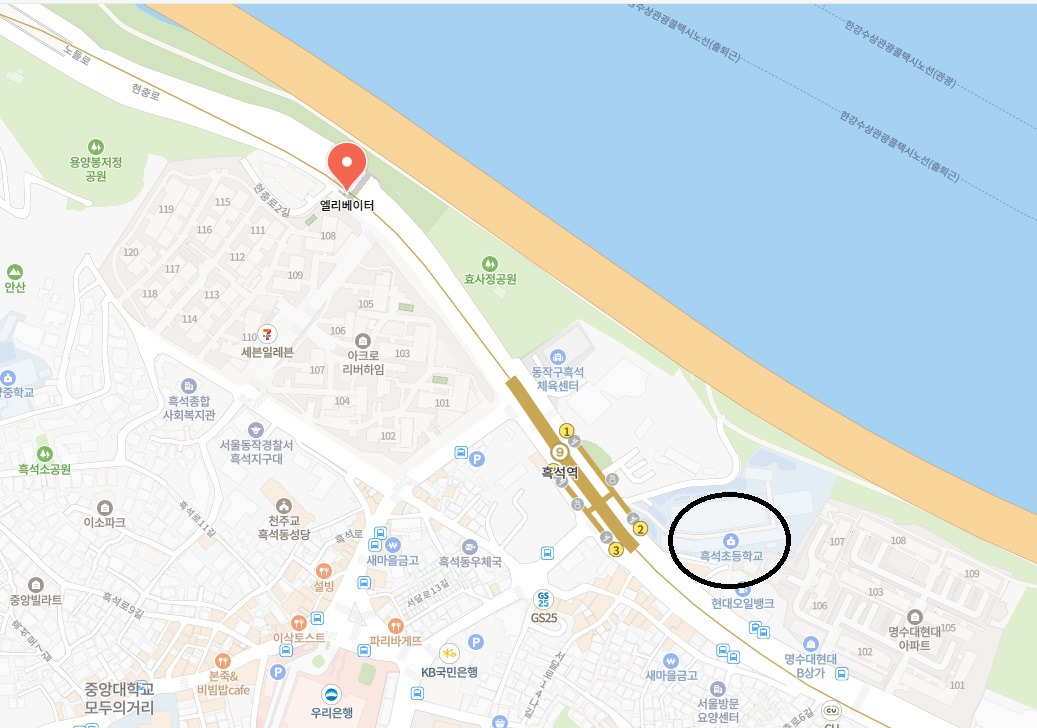 흑석초에서 한강으로 내려가는 길이면