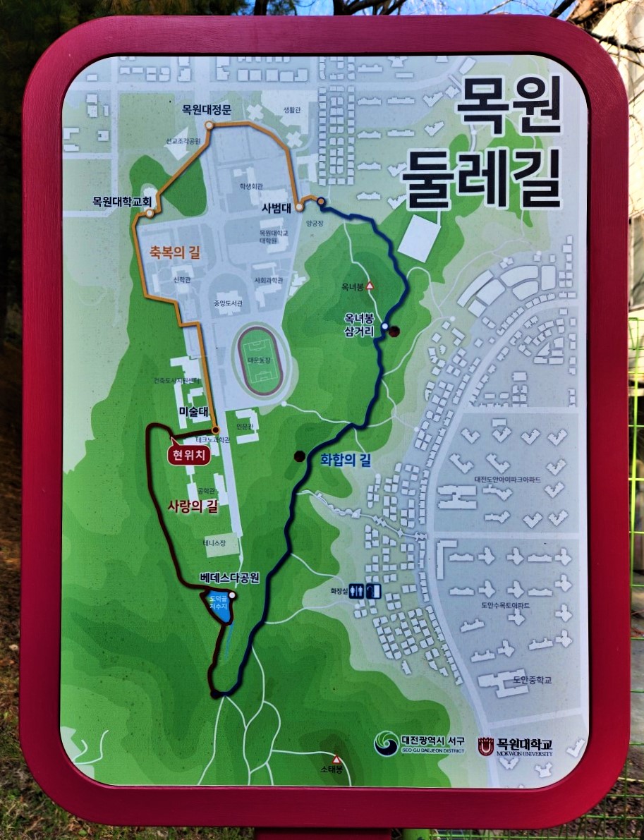 *걷는길 : 목원대 입구-옥녀봉-소태봉-운전자푸른쉼터-도안근린공원-목원대 연못-목원대 조각공원-원점