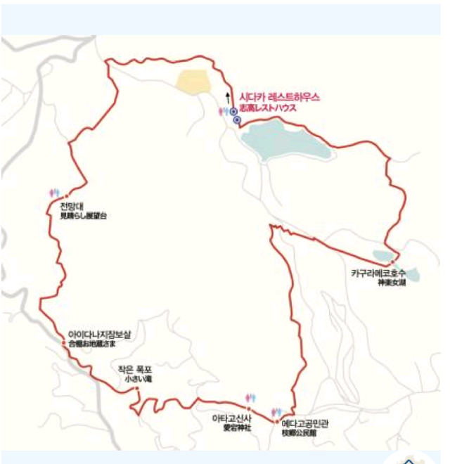 ♣ 큐슈올레 벳부코스- 트레킹 (3~4시간) <큐슈올레 코스> : 시다카 레스트하우스 - 전망대- 아이다니지장보살 - 작은폭포 - 아타고신사 - 에다고공민관 - 카구라에코호수 - 시다카 레스트하우스 (원점)