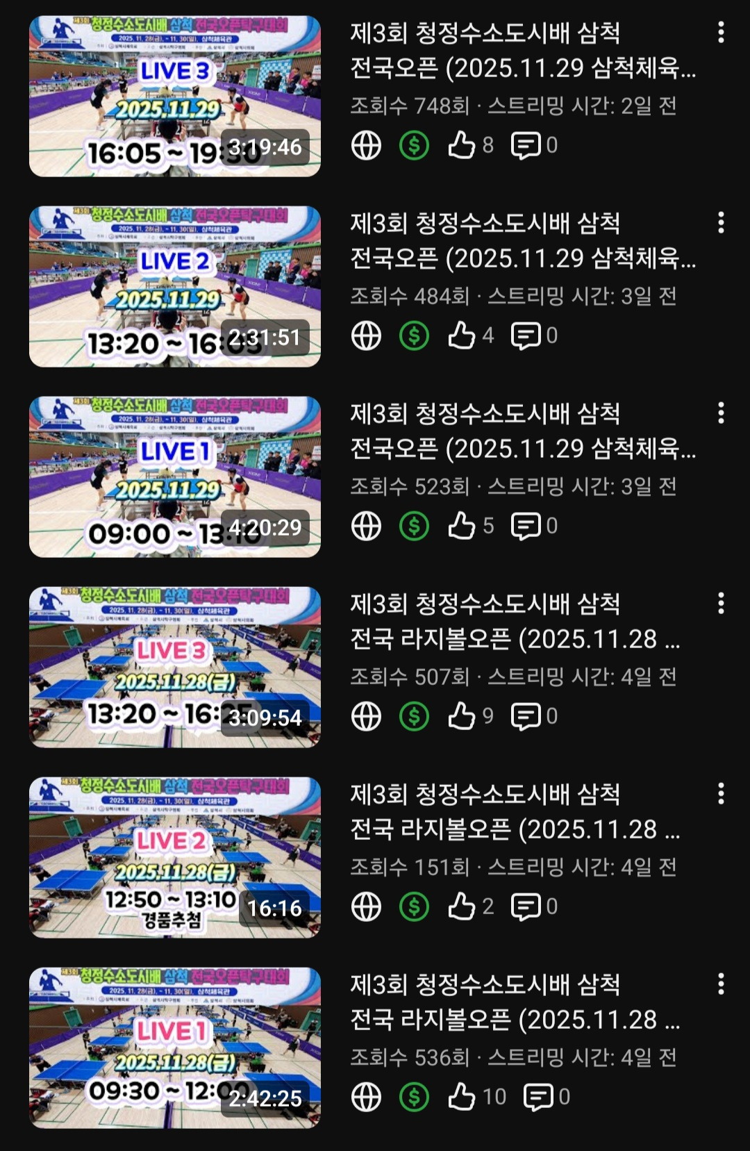 이 번 청정수소도시배 삼척 전국오픈탁구대회는 대회 첫날인 28일(금)은 전국 라지볼오픈경기에 이어 29일(토)은 일반볼 전국오픈으로 개인단식과 개인복식으로 진행되었으며, 대회 3일차인 30(일)은 단체전으로 피날레를 장식하였습니다.