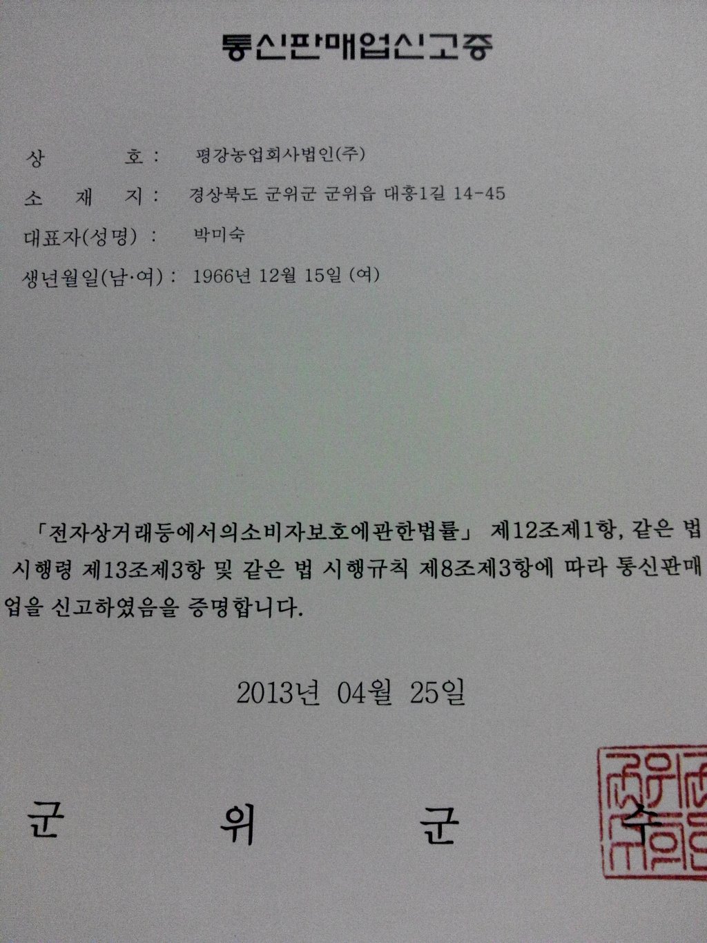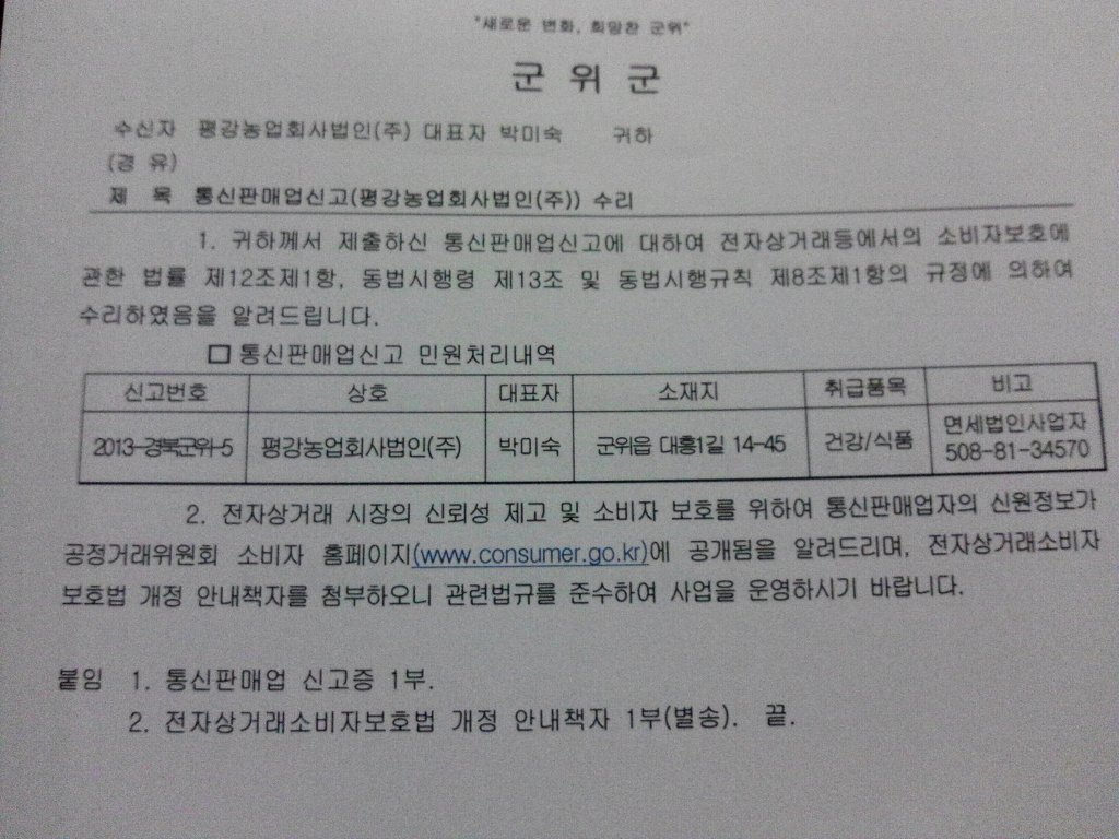 통신 판매업 신고증 나왔네요. 작성자고사리회장 (홍수희)|작성시간13.04.30|조회수315 목록 댓글 2 글자크기 작게가 글자크기 크게가 사업자 등록증사본.은행 에스크로 확인서.법인등기부 등본. 신분증.도장 들고 군청에 통신 판매업 신고후 3일만에 나왔어요. 다음검색 현재 게시글 추가 기능 열기 북마크 공유하기 신고 센터로 신고 댓글 댓글 2 댓글쓰기 답글쓰기 댓글 리스트 작성자캔디 | 작성시간 13.05.01 추카해요^^ 답댓글 작성자고사리회장 (홍수희) 작성자 본인 여부 작성자 | 작성시간 13.05.01 감사해요^^* 댓글 전체보기