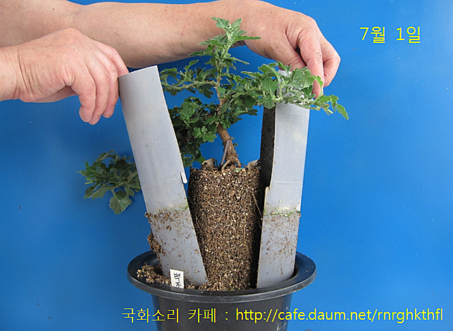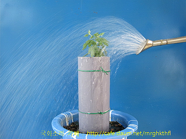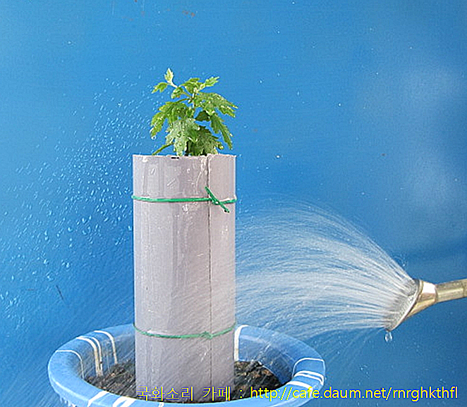 원통의 위쪽으로 관수합니다. 한 달 후, 뿌리가 원통 높이의 반 정도로 자라내립니다.