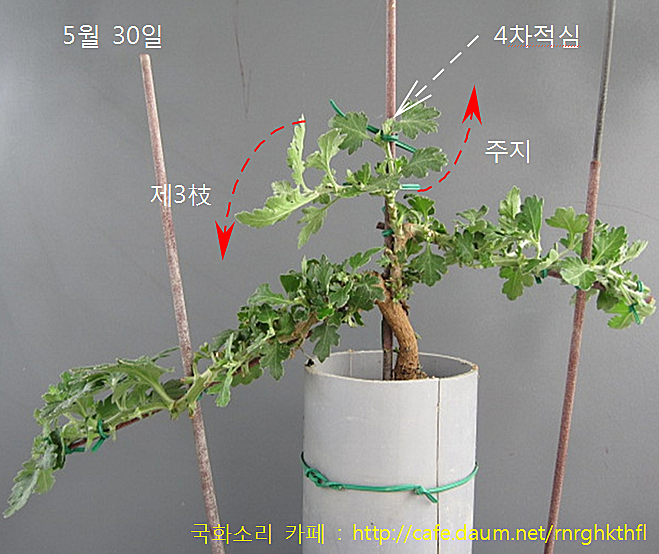 제3枝를 좌측으로 유인해 내리고,