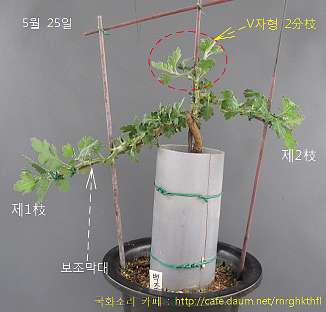 제1枝와 제2枝가 유용한 V자형 2갈래로 되도록 손질하여 도와주어야 합니다.