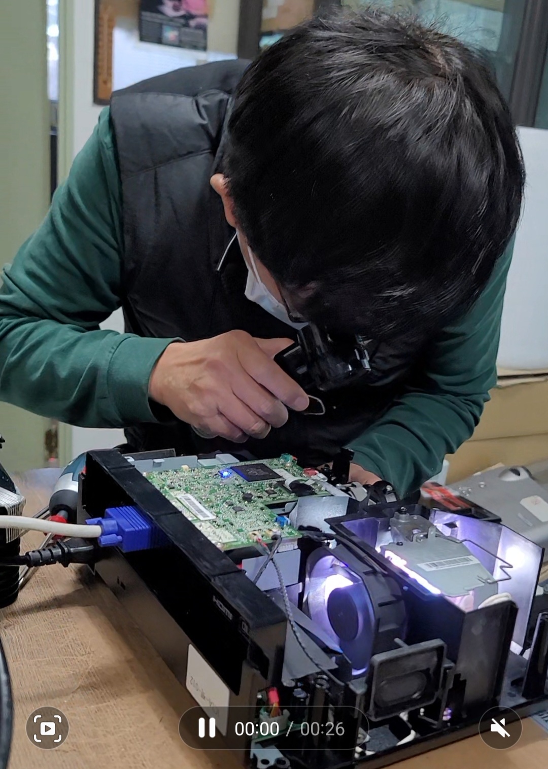 프로젝터가 전원이 안 들어오고 화면이 안 켜져서 원장님께서 직접 프로젝트를 가지고 당사로 방문해서 수리 의뢰한 건임