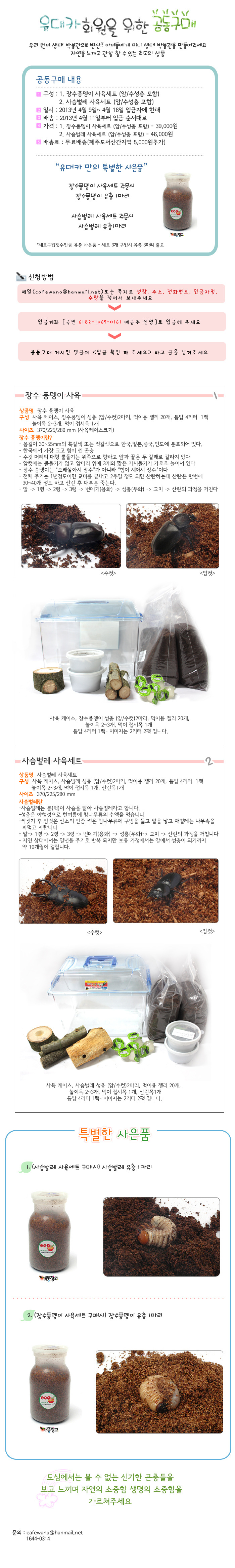 =마감=[미니생태박물관] 아이들에게 미니 생태 박물관을 만들어주세요. 장수풍뎅이/사슴벌레사육세트 작성자유.대.카|작성시간13.04.09|조회수540 목록 댓글 4 글자크기 작게가 글자크기 크게가 마감되었습니다. 개똥창고 쇼핑몰(http://www.yoodeca.co.kr)에서 구매 가능합니다. 다음검색 현재 게시글 추가 기능 열기 북마크 공유하기 신고 센터로 신고 댓글 댓글 4 댓글쓰기 답글쓰기 댓글 리스트 작성자해린짱!!! | 작성시간 13.04.10 안녕하세요. 착한어린이집입니다. 입금확인부탁드립니다. 답댓글 작성자유.대.카 작성자 본인 여부 작성자 | 작성시간 13.04.11 입금확인되었습니다. 감사합니다. ^^ 작성자나만봐봐 | 작성시간 13.04.12 아름드리나무어린이집 입금확인 부탁드립니다. 답댓글 작성자유.대.카 작성자 본인 여부 작성자 | 작성시간 13.04.15 입금확인되었습니다. 감사합니다. ^^ 댓글 전체보기