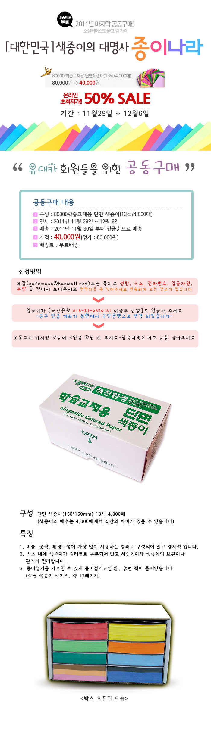 =마감=[50% 할인 공동구매][종이나라]80000 친환경 학습교재용 단면색종이(1BOX/13색/4000매) 신학기를 위해 미리 준비하세요 작성자유.대.카|작성시간11.11.29|조회수576 목록 댓글 28 글자크기 작게가 글자크기 크게가 =본 공동구매는 마감되었습니다= 신청및 문의 : 1644-0314 / cafewana@hanmail.net * 공동구매는 부가세 별도입니다 다음검색 현재 게시글 추가 기능 열기 북마크 공유하기 신고 센터로 신고 댓글 댓글 28 댓글쓰기 답글쓰기 댓글 리스트 답댓글 작성자유.대.카 작성자 본인 여부 작성자 | 작성시간 11.12.06 확인 되셨습니다. 감사합니다. ^^ 작성자작은공주 | 작성시간 11.12.05 입금확인해주세요~이지미 답댓글 작성자유.대.카 작성자 본인 여부 작성자 | 작성시간 11.12.06 확인 되셨습니다. 감사합니다. ^^ 작성자언제나 맑음!!! | 작성시간 11.12.08 1 Box 입금 확인 해주세요.. 입금-조은제 작성자띠꾸 | 작성시간 11.12.16 배송은 언제 되나요? 댓글 전체보기