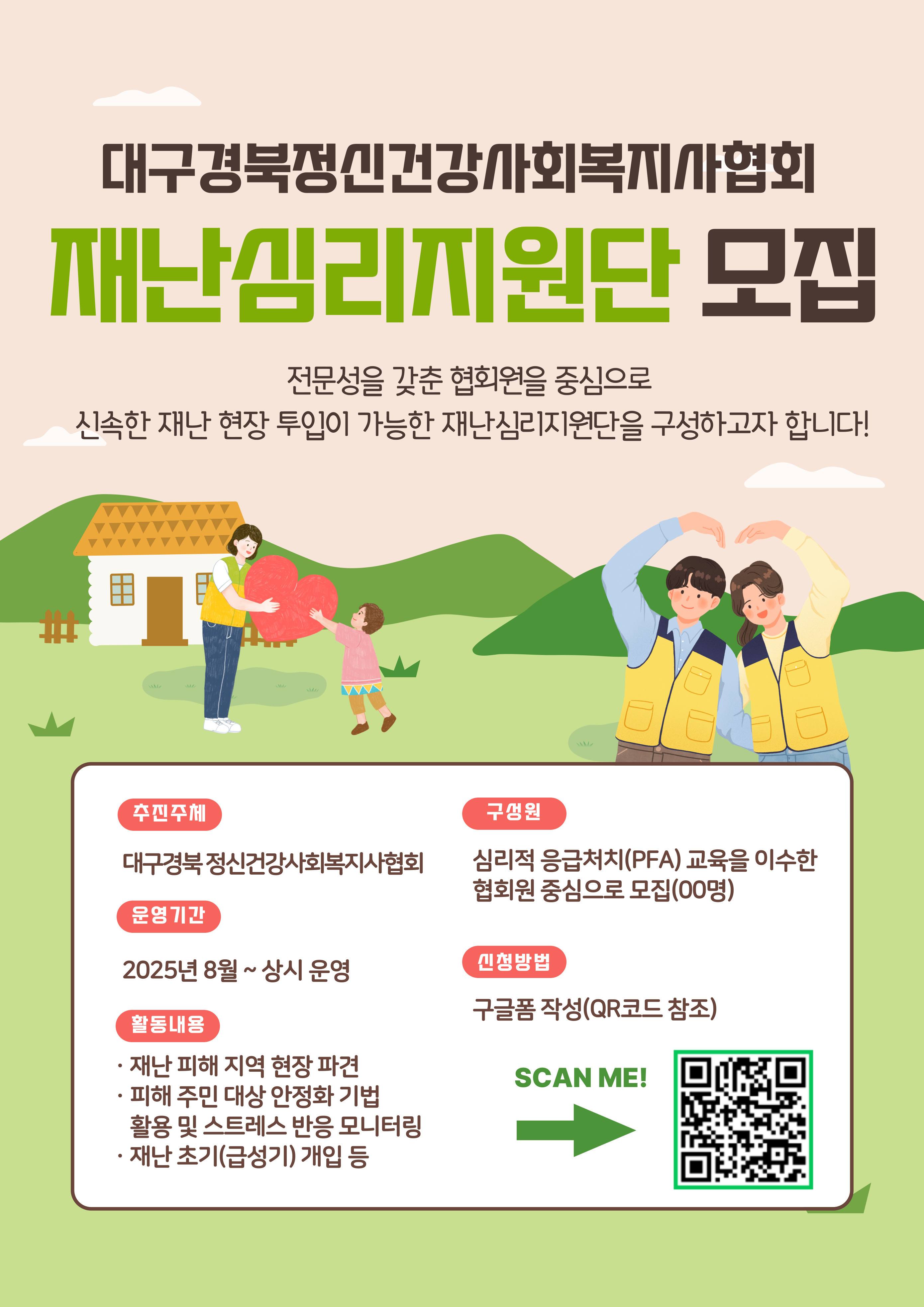 재난심리지원단 모집 작성자강미화/대구|작성시간25.08.21|조회수45 목록 댓글 0 글자크기 작게가 글자크기 크게가 다음검색 현재 게시글 추가 기능 열기 북마크 공유하기 신고 센터로 신고 댓글 댓글 0 댓글쓰기 답글쓰기 댓글 리스트