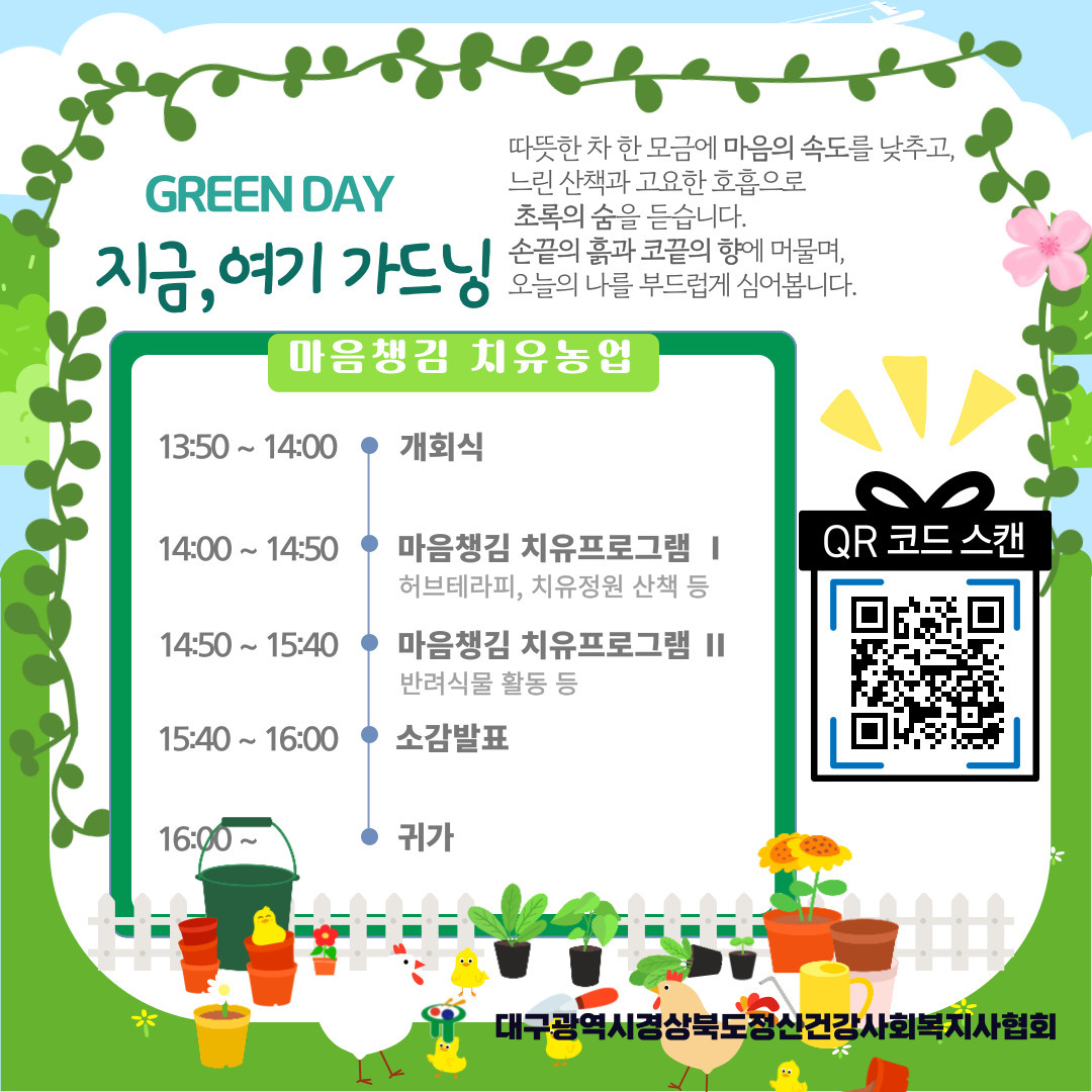 [대구] 마음챙김 치유농업프로그램 소개합니다. 작성자오혜석/대구|작성시간25.09.02|조회수57 목록 댓글 0 글자크기 작게가 글자크기 크게가 다음검색 현재 게시글 추가 기능 열기 북마크 공유하기 신고 센터로 신고 댓글 댓글 0 댓글쓰기 답글쓰기 댓글 리스트