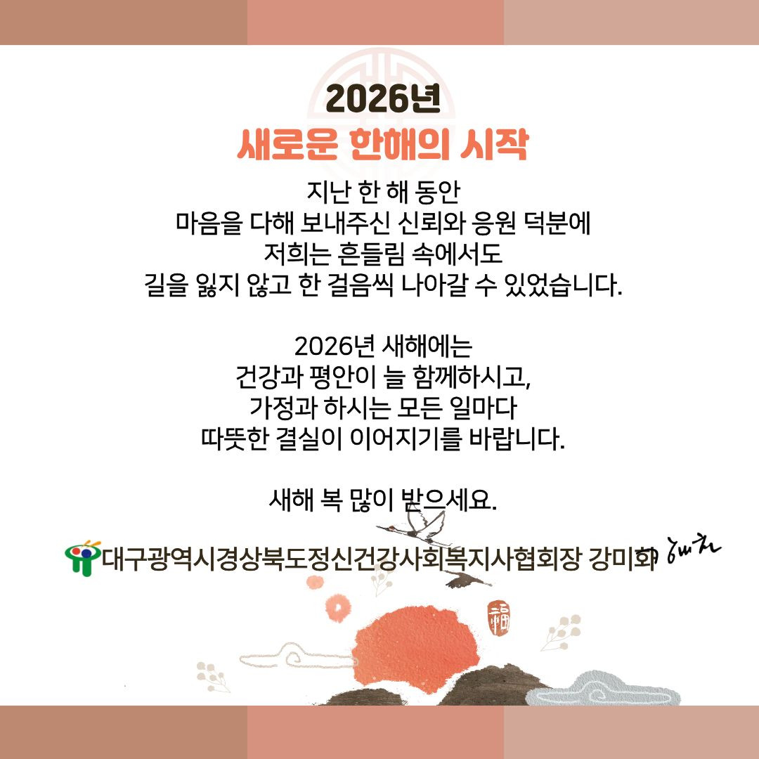대구경북정신건강사회복지사협회원님 새해 복 많이 받으세요 작성자강은혜/대구|작성시간26.02.12|조회수28 목록 댓글 0 글자크기 작게가 글자크기 크게가 다음검색 현재 게시글 추가 기능 열기 북마크 공유하기 신고 센터로 신고 댓글 댓글 0 댓글쓰기 답글쓰기 댓글 리스트