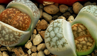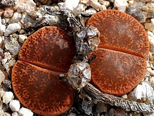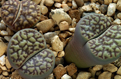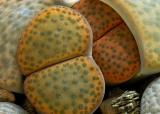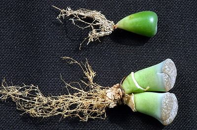 아래 그림은 코노피텀 ( C. minutum ( 위 ))과 리톱스 ( L. lesliei (아래 ))의 수분이 저장된 잎, 짧은 줄기 그리고 가늘고 긴 뿌리이다.