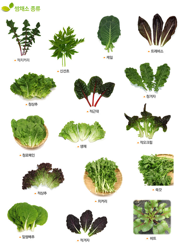 가. 잎채소 : 배추, 상추, 잎케일, 엔다이브, 호박잎, 들깨잎 등