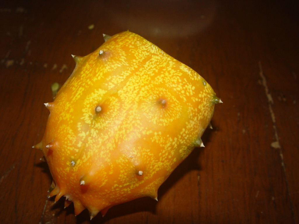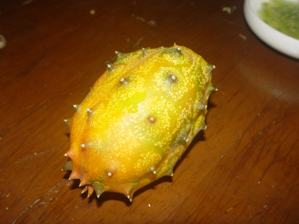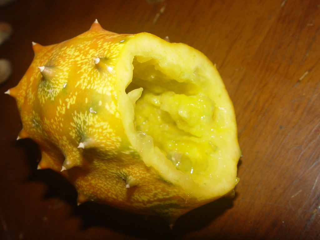 독특한 외양이 인상적. 젤리 상태의 속은 바나나와 라임을 섞어 놓은 듯한 맛으로 식감은 오이와 비슷합니다.