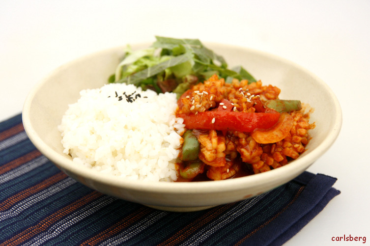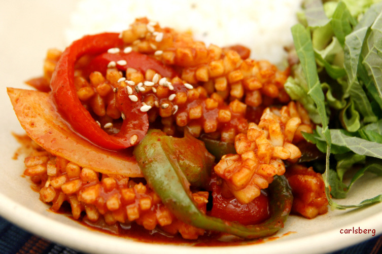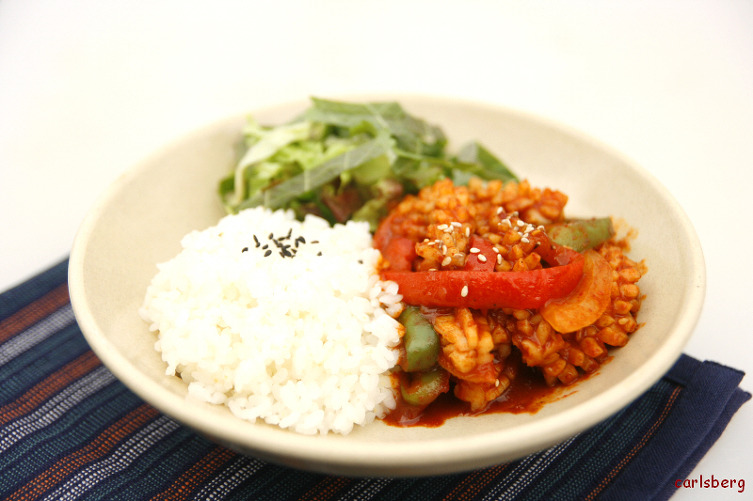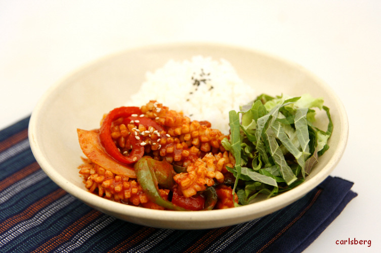 오징어볶음을 덮밥으로 즐기면 더 멋진 한끼의 식사가 되지요.