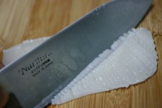 오징어 안쪽에 칼집을 대각선으로 깊숙히 넣고 1cm 간격으로 잘라 놓습니다.