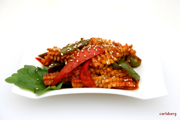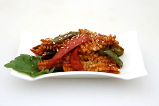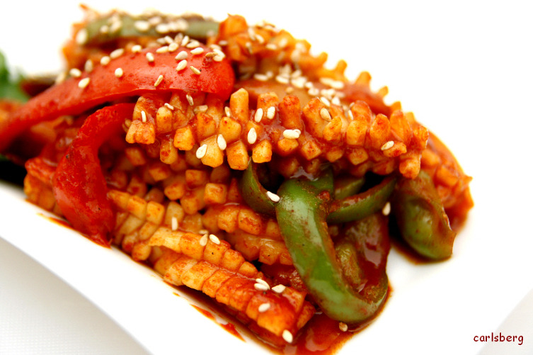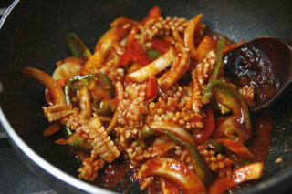 매콤하면서 쫄깃한 맛을 자랑하는 오징어볶음...피망과 함께 하여 더욱 멋진 향까지 음미할 수 있습니다.