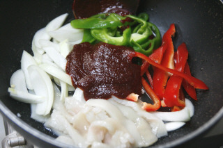 피망과 양파는 적당한 크기로 자르고, 팬에 오징어와 양파. 피망을 넣고 양념장 3큰술을 넣은 다음, 다시마 국물을 넣고