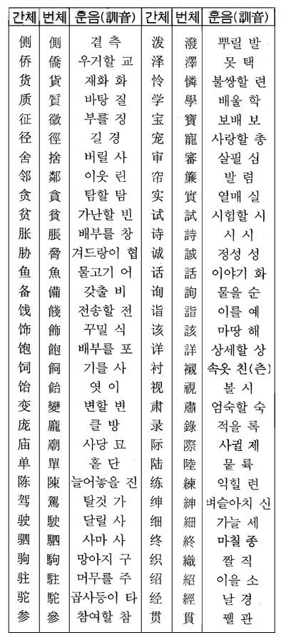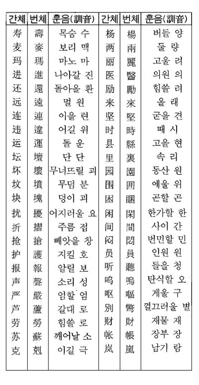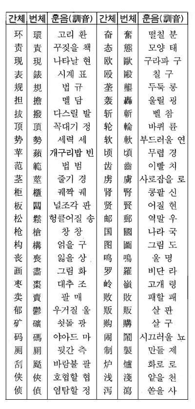 간체자 대조표