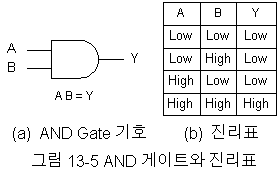 AND 게이트의 출력상태가 High Level이 되기 위해서는 모든 입력상태가 High Level이 되어야 한다. 그림 13-5는 AND 게이트와 진리표를 나타낸다.